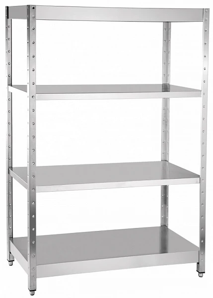 Все элементы стеллажа изготовлены из нержавеющей стали. Стойки стеллажа имеют крепежные отверстия для установки полок на любой необходимой высоте.