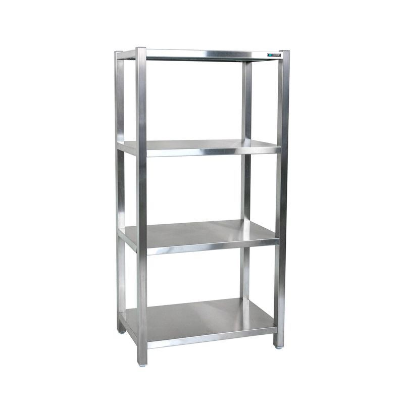 Полки стеллажа изготовлены из пищевой нержавеющей стали, что облегчает их санитарную обработку и уборку.
