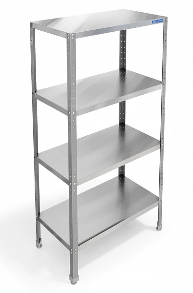 Полки сплошные изготовлены из нержавеющей стали AISI430 толщиной 0,8мм , могут крепиться на требуемой высоте - шаг 100 мм.