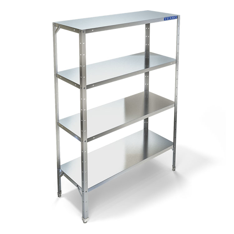 Четыре сплошные полки из нержавеющей стали марки AISI 304 толщиной 0,8мм. Расстояние между полками регулируемое с шагом 50мм.