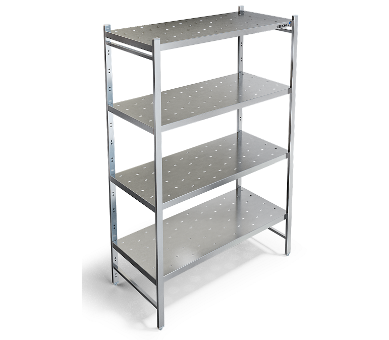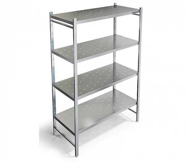 Разборный каркас выполнен из трубы 40х20 мм из нержавеющей стали AISI 430 толщиной 1,2 мм. Четыре перфорированные полки из нержавеющей стали марки AISI 304 толщиной 0,8мм. Стеллаж поставляется в разобранном виде.
