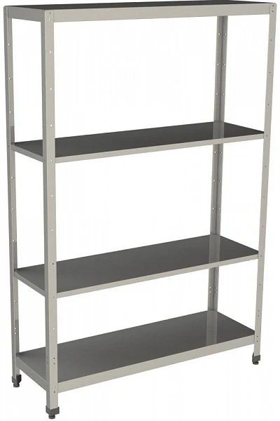 Стеллаж состоит из вертикальных опор и стальных полок без перфорации.