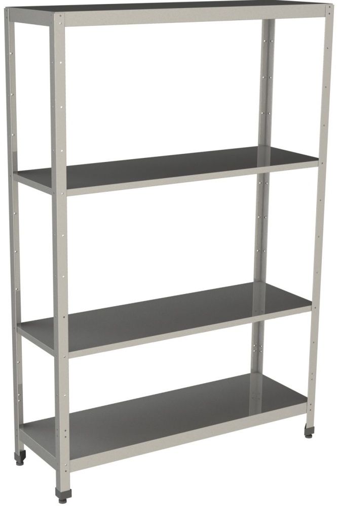 Стеллаж состоит из вертикальных опор и стальных полок без перфорации.