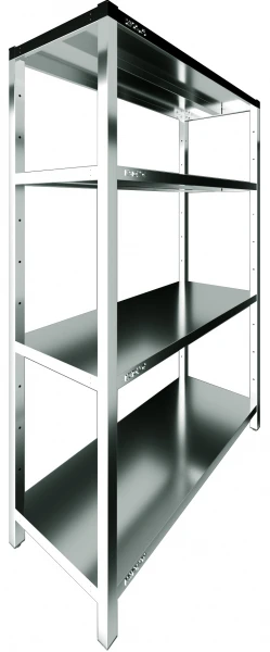 Модель оснащена 4 регулируемыми по высоте сплошными полками и ребрами жесткости. Разборный каркас выполнен из уголка 40х40 мм оцинкованной стали, ребра жесткости и полки - из нержавеющей стали AISI 430.