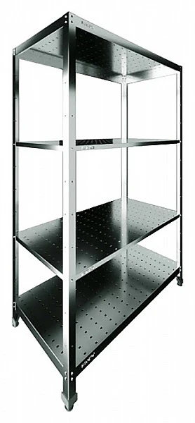 Стеллаж состоит из вертикальных опор и стальных полок с перфорацией.