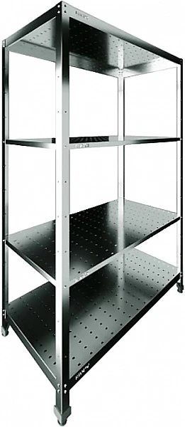 Стеллаж состоит из вертикальных опор и стальных полок с перфорацией.