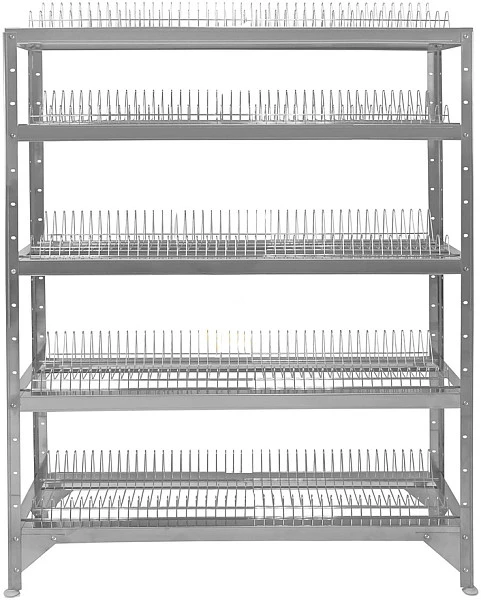 Стеллаж состоит из пяти решетчатых полок для тарелок и четырех стоек.