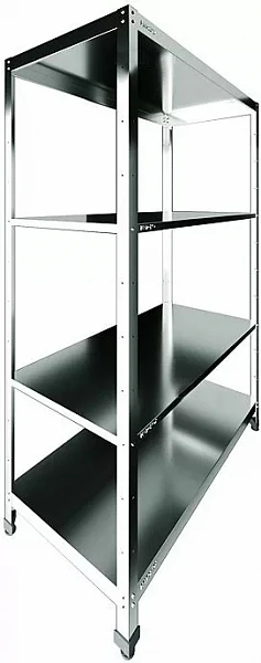 Стеллаж состоит из вертикальных опор и стальных полок без перфорации.