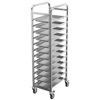Рамы приварены друг к другу посредством перемычек из профильной нержавеющей трубы. К рамам приварены 12 пар направляющих для размещения гастроемкостей GN1/1. Направляющие изготовлены из нержавеющей стали AISI 304. Они имеют концевые отгибы, обеспечивающие фиксацию противней и предотвращающие их выпадение при движении шпильки. Расстояние между направляющими по высоте - 110 мм. Суммарная грузоподъемность тележки составляет 160 кг. Нагрузка на каждый уровень направляющих не должна превышать 10 кг.