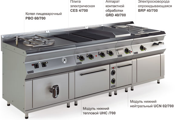 В ассортимент тепловой линии вошли такие изделия, как электрическая плита, контактный гриль, пищеварочный котел, сковорода, а также модули.