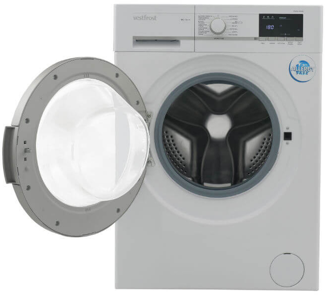 Стиральная машина Vestfrost VFWM 1450 WE с загрузкой 7 кг представлена в оригинальном дизайне классическим белым люком шириной 47 см.