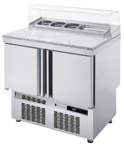 Стол для пиццы Coreco MFP100 используется на предприятиях общественного питания и торговли для раскатки теста и обработки ингредиентов для приготовления пиццы, охлаждения и кратковременного хранения скоропортящихся продуктов и напитков.
