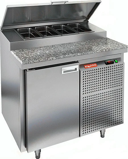 Стол для пиццы Hicold PZ2-1/GN (1/6H) с каменной столешницей и распашными дверями используется для раскатки теста и обработки ингредиентов для приготовления пиццы, а также для охлаждения и кратковременного хранения скоропортящихся продуктов и напитков на предприятиях общественного питания и торговли.
