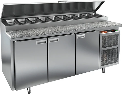Стол для пиццы Hicold PZ2-111/GN (1/6H) с гранитной столешницей и распашными дверями используется для раскатки теста и обработки ингредиентов для приготовления пиццы, а также для охлаждения и кратковременного хранения скоропортящихся продуктов и напитков на предприятиях общественного питания и торговли.