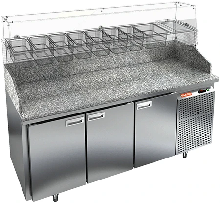 Стол для пиццы Hicold PZ3-111/SN (без витрины) с гранитной столешницей и распашными дверями используется для раскатки теста и обработки ингредиентов для приготовления пиццы, а также для охлаждения и кратковременного хранения скоропортящихся продуктов и напитков на предприятиях общественного питания и торговли.