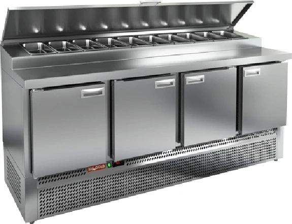 Стол для пиццы Hicold PZE1-1111/GN (1/3H) со столешницей из нержавеющей стали и распашными дверями используется для раскатки теста и обработки ингредиентов для приготовления пиццы, а также для охлаждения и кратковременного хранения скоропортящихся продуктов и напитков на предприятиях общественного питания и торговли.