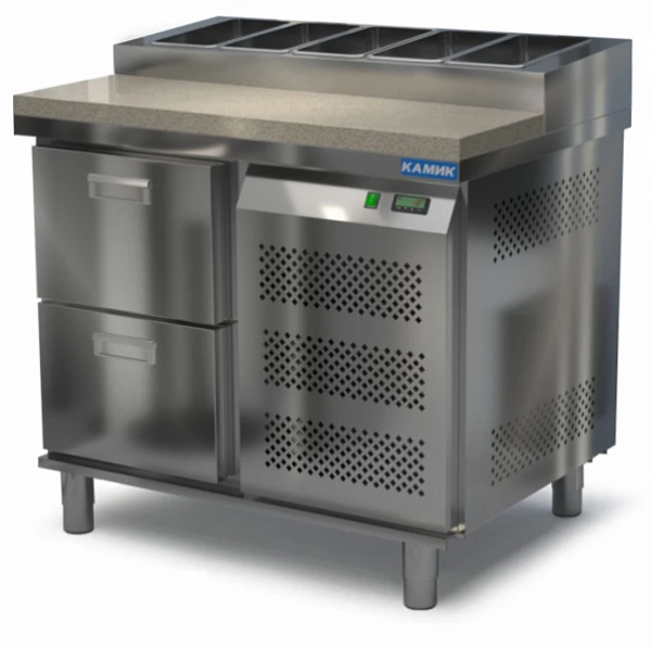 Стол для пиццы Камик СОП-021073К используется на предприятиях общественного питания и торговли для хранения пиццы, салатов, сэндвичей и других блюд и ингредиентов к ним в охлажденном состоянии.