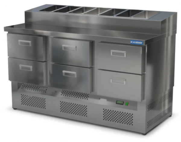 Стол для пиццы Камик СОП-061573Н используется на предприятиях общественного питания и торговли для хранения пиццы, салатов, сэндвичей и других блюд и ингредиентов к ним в охлажденном состоянии.