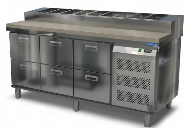 Стол для пиццы Камик СОП-0618576К используется на предприятиях общественного питания и торговли для хранения пиццы, салатов, сэндвичей и других блюд и ингредиентов к ним в охлажденном состоянии.