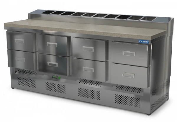 Стол для пиццы Камик СОП-082073КН используется на предприятиях общественного питания и торговли для хранения пиццы, салатов, сэндвичей и других блюд и ингредиентов к ним в охлажденном состоянии.
