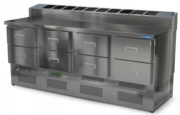 Стол для пиццы Камик СОП-082073Н используется на предприятиях общественного питания и торговли для хранения пиццы, салатов, сэндвичей и других блюд и ингредиентов к ним в охлажденном состоянии.
