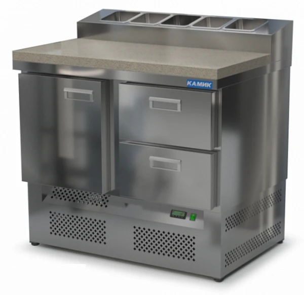 Стол для пиццы Камик СОП-121076КН используется на предприятиях общественного питания и торговли для хранения пиццы, салатов, сэндвичей и других блюд и ингредиентов к ним в охлажденном состоянии.