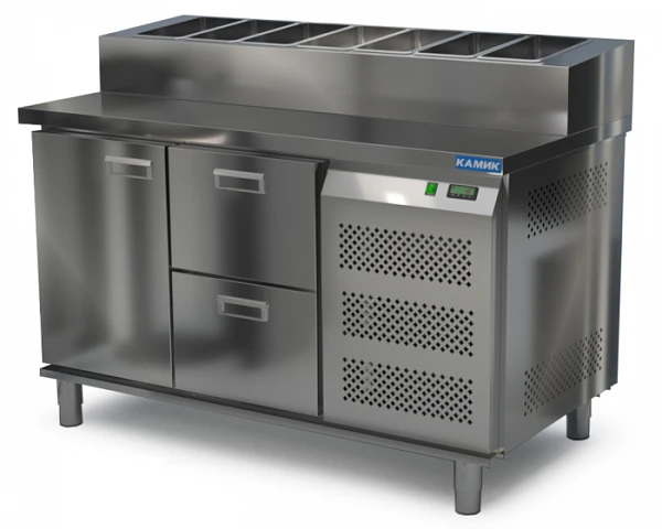Стол для пиццы Камик СОП-121473 используется на предприятиях общественного питания и торговли для хранения пиццы, салатов, сэндвичей и других блюд и ингредиентов к ним в охлажденном состоянии.