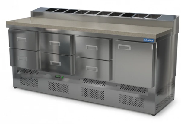 Стол для пиццы Камик СОП-162076КН используется на предприятиях общественного питания и торговли для хранения пиццы, салатов, сэндвичей и других блюд и ингредиентов к ним в охлажденном состоянии.