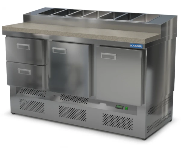 Стол для пиццы Камик СОП-221576КН используется на предприятиях общественного питания и торговли для хранения пиццы, салатов, сэндвичей и других блюд и ингредиентов к ним в охлажденном состоянии.