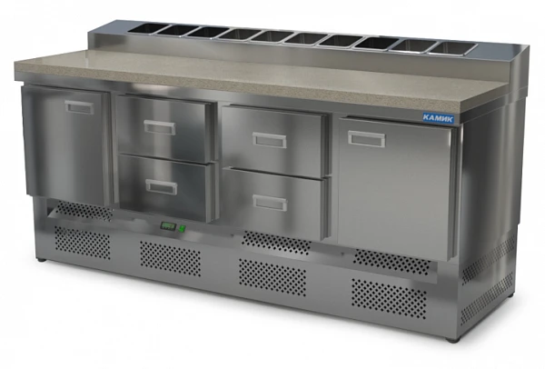 Стол для пиццы Камик СОП-242076КН используется на предприятиях общественного питания и торговли для хранения пиццы, салатов, сэндвичей и других блюд и ингредиентов к ним в охлажденном состоянии.