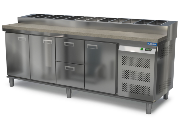 Стол для пиццы Камик СОП-322373К используется на предприятиях общественного питания и торговли для хранения пиццы, салатов, сэндвичей и других блюд и ингредиентов к ним в охлажденном состоянии.