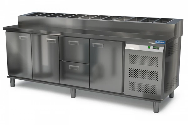 Стол для пиццы Камик СОП-322376 используется на предприятиях общественного питания и торговли для хранения пиццы, салатов, сэндвичей и других блюд и ингредиентов к ним в охлажденном состоянии.