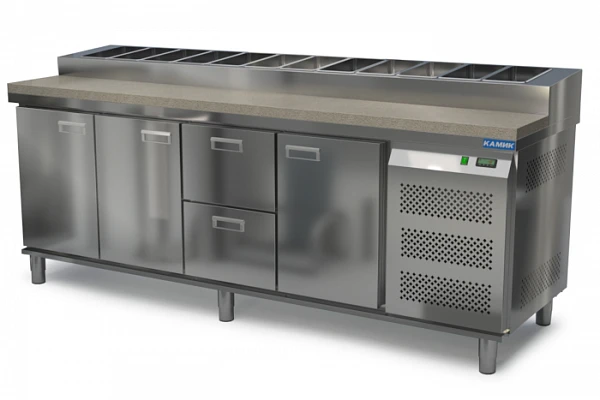 Стол для пиццы Камик СОП-322376К используется на предприятиях общественного питания и торговли для хранения пиццы, салатов, сэндвичей и других блюд и ингредиентов к ним в охлажденном состоянии.
