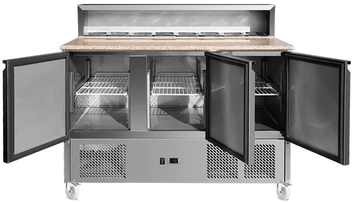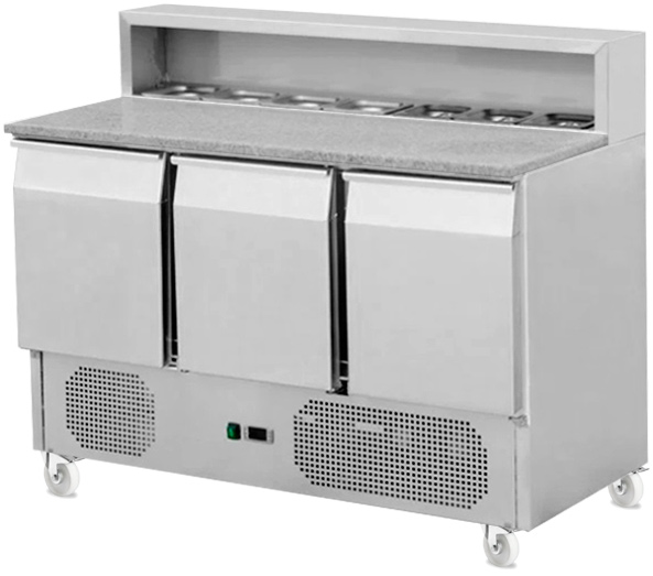 Стол для пиццы Koreco PS/903 с охлаждаемым внутренним объемом и встроенной витриной для ингредиентов спроектирован для сбора пиццы, сэнвичей, сервировки холодных блюд.