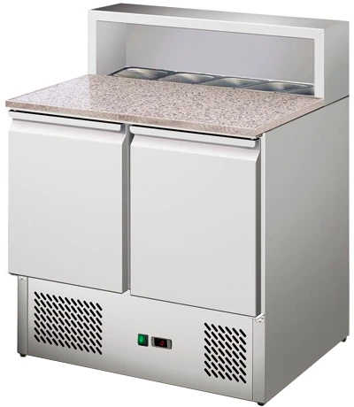 Стол для пиццы Koreco PS900 с охлаждаемым внутренним объемом и встроенной витриной для ингредиентов спроектирован для сбора пиццы, сэнвичей, сервировки холодных блюд.