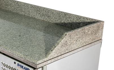 С трех сторон рабочая поверхность стола ограничена гранитными бортами высотой 150 мм. Такая конструкция позволяет удобно разместить на столах охлаждаемую витрину для ингредиентов (топингов), не занимая при этом пространства столешницы и не мешая работе пиццайоло.