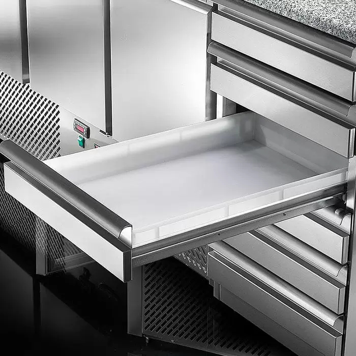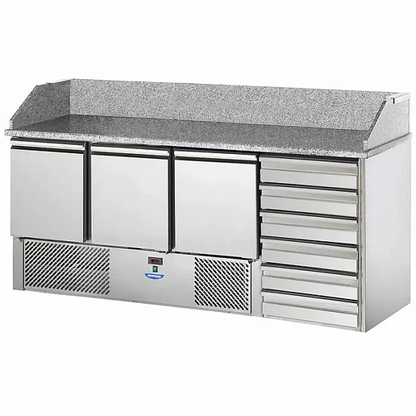 Стол для пиццы Tecnodom SLV03C6 используется для раскатки теста и обработки ингредиентов, используемых для приготовления пиццы, салатов и других блюд, а также для охлаждения и кратковременного хранения скоропортящихся продуктов и напитков.Это устройство невероятно универсальное, его использование даёт возможность раскатывать тесто, делать заготовки из теста в неограниченном количестве и гарантировать быстрое приготовление любых блюд из теста. Особого актуально использование стола в том случае, если вы специализируетесь на приготовлении блюд из теста с разными начинками.
