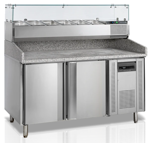 Стол для пиццы Tefcold PT1200 + VK38-150 используется на предприятиях общественного питания и торговли для хранения пиццы, салатов, сэндвичей и других блюд и ингредиентов к ним в охлажденном состоянии.