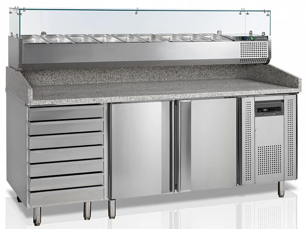 Стол для пиццы Tefcold PT1310 + VK38-200 предназначен для хранения охлажденных продуктов и ингредиентов для салатов, пиццы и сендвичей в охлаждающем шкафу и витрине, а так же для использования рабочей столешницы из гранита для приготовления блюд.
