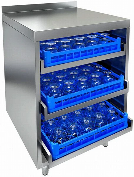 Столы для посудомоечных машин позволяют удобно размещать корзины с уже вымытой посудой и кухонным инвентарём, который только планирует отправиться в посудомойку. Т