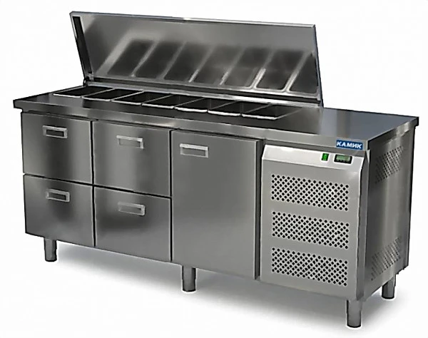 Стол для салатов Камик СОН-1418563К предназначен для кратковременного хранения ингредиентов для приготовления салатов на предприятиях пищевой промышленности, общественного питания и торговли.