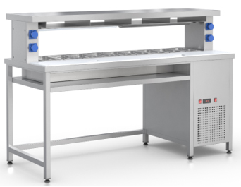 Стол фасовочный RoboLabs СФ-190Т пристенный с охлаждаемой ванной на 9 GN1/3 глубиной 100 мм и тепловой поверхностью.