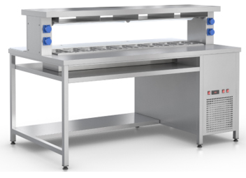 Стол фасовочный RoboLabs СФО-190 островной с охлаждаемой ванной на 9 GN1/3 глубиной 100 мм и тепловой поверхностью.