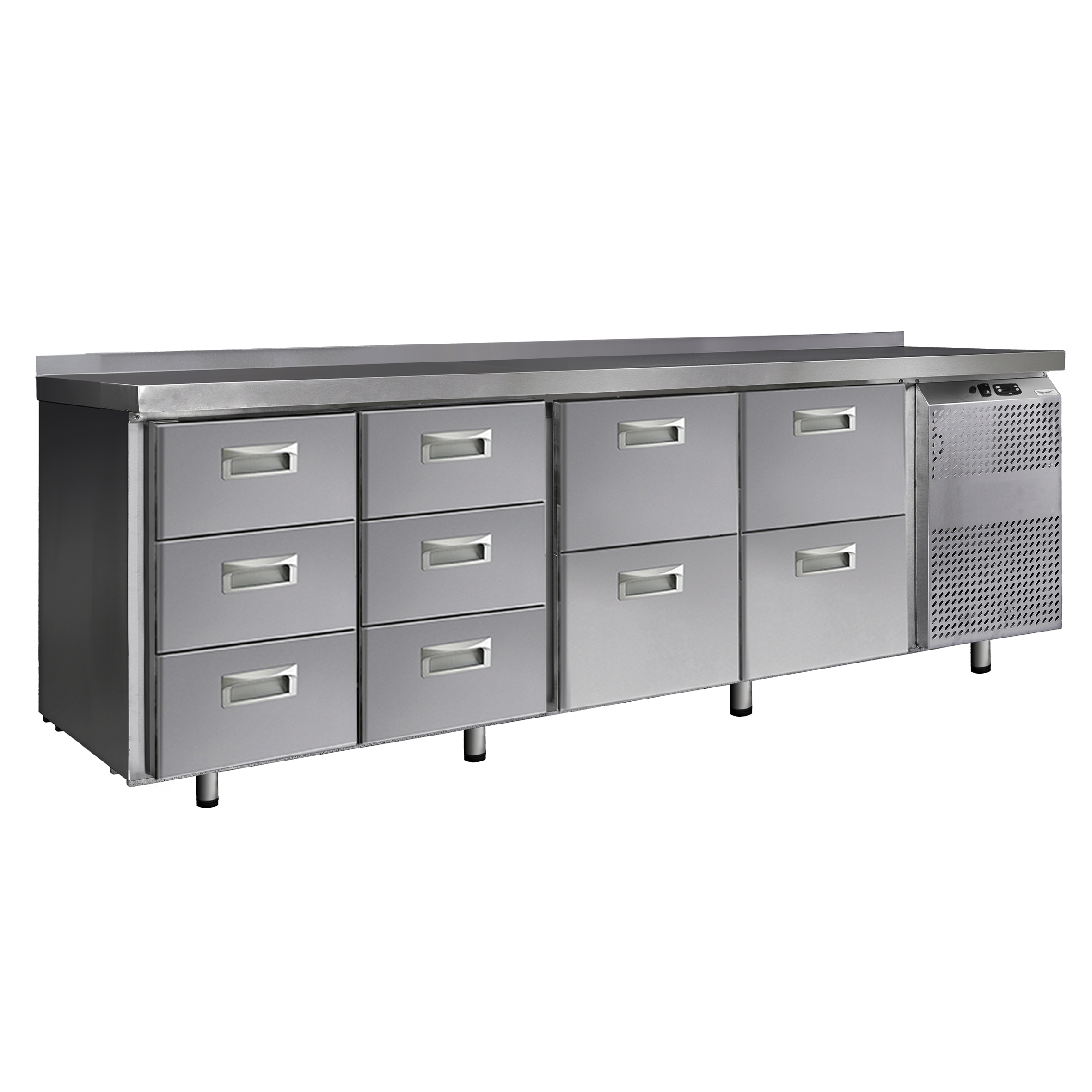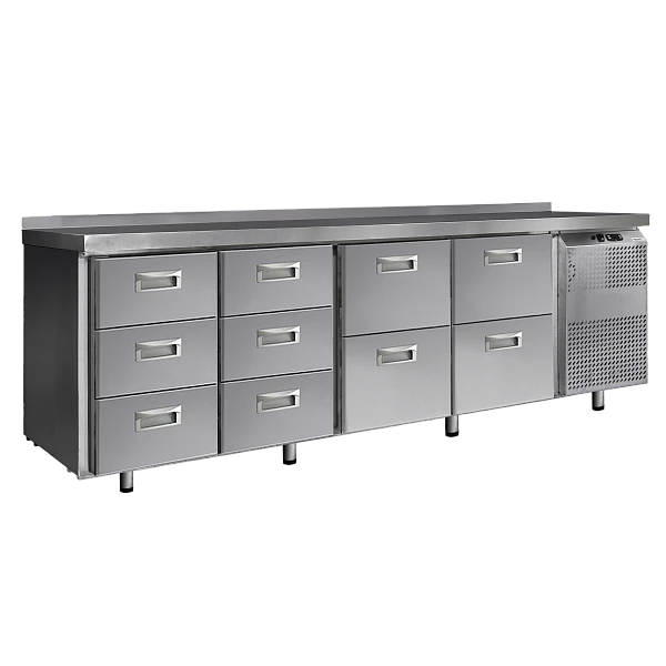 Холодильный стол выполнен из высококачественной пищевой нержавеющей стали. Столы могут производиться (выпускаться) с распашными дверями (ящиками), которые имеют надежные петли (для ящиков направляющие) с опцией доводчиков, что обеспечивает гарантированное закрытие и поддержание заданной температуры в рабочем объеме стола. Используется электрический блок управления с функцией автоматической оттайки. Передняя панель моторного отсека имеет большую площадь перфорации, что позволяет обеспечить холодильному агрегату поступление воздуха для охлаждения.
