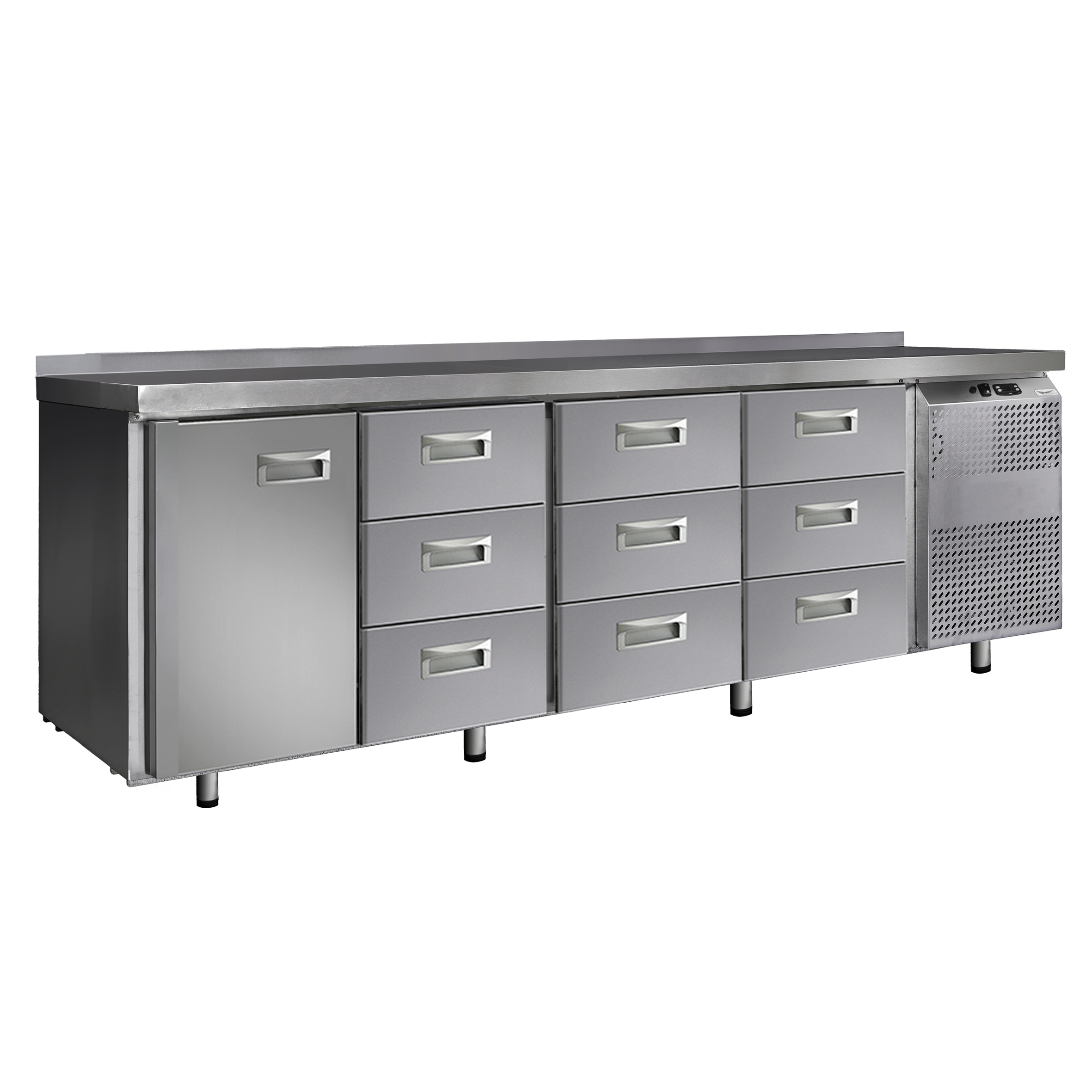 Холодильный стол выполнен из высококачественной пищевой нержавеющей стали. Столы могут производиться (выпускаться) с распашными дверями (ящиками), которые имеют надежные петли (для ящиков направляющие) с опцией доводчиков, что обеспечивает гарантированное закрытие и поддержание заданной температуры в рабочем объеме стола. Используется электрический блок управления с функцией автоматической оттайки. Передняя панель моторного отсека имеет большую площадь перфорации, что позволяет обеспечить холодильному агрегату поступление воздуха для охлаждения.
