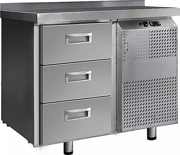 Стол холодильный Финист СХС-700-0/3 предназначен для хранения предварительно охлажденных мясных и рыбных полуфабрикатов, заготовок для салатов, молочной продукции, охлажденных напитков и других пищевых продуктов на предприятиях общественного питания и торговли. Модель оснащена расположенным сбоку агрегатным отсеком, столешницей с задним бортом, 3 выдвижными ящиками, устойчивыми ножками с подпятниками, кабелем питания с евровилкой и кнопочной панелью управления с цифровым дисплеем.