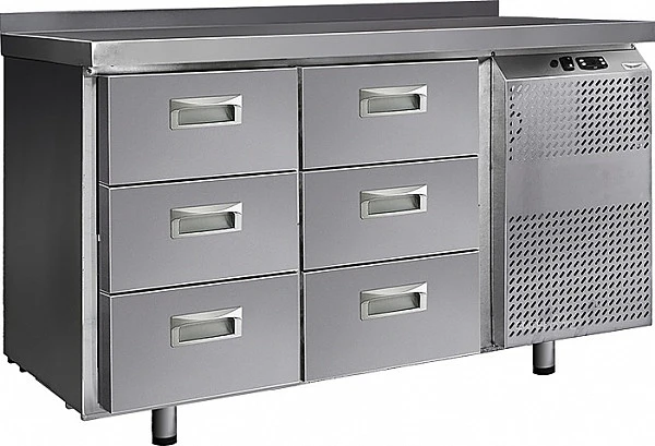 Стол холодильный Финист СХС-700-0/6 (1400х700х850) предназначен для хранения предварительно охлажденных мясных и рыбных полуфабрикатов, заготовок для салатов, молочной продукции, охлажденных напитков и других пищевых продуктов на предприятиях общественного питания и торговли. Модель оснащена расположенным сбоку агрегатным отсеком, столешницей с задним бортом, 6 выдвижными ящиками, устойчивыми ножками с подпятниками, кабелем питания с евровилкой и кнопочной панелью управления с цифровым дисплеем. Корпус выполнен из высококачественной нержавеющей стали.