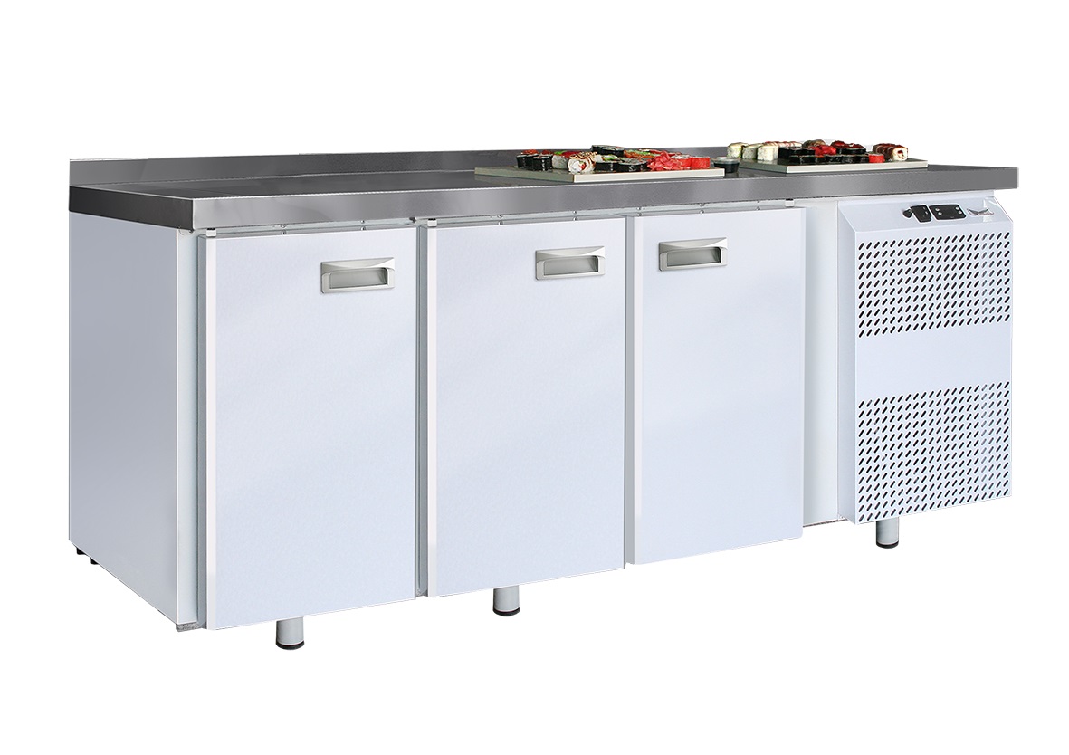 Корпус холодильного стола выполнен из оцинкованной стали с полимерным покрытием, столешница из нержавеющей стали