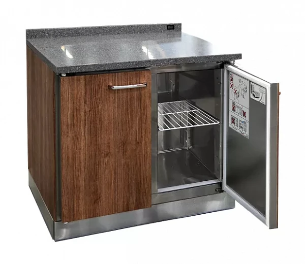 Отделка мдф и гранитом позволяет разместить стол на открытом видном месте или даже на домашней кухне. Выпускается с распашными дверями или ящиками, которые имеют надежные петли с опцией доводчиков.