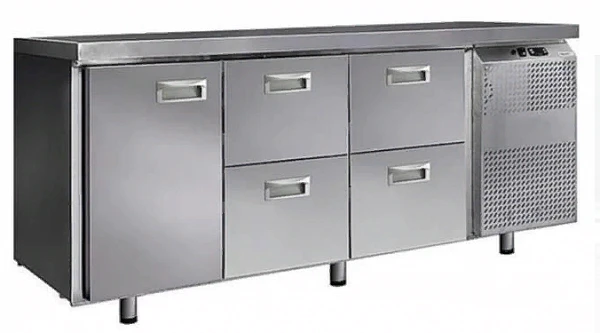 Данный стол сочетает в себе два рабочих объёма: первый призван хранить в себе продукты при температуре -2…+8°С, а второй -10…-18°С. Тем самым комбинированный стол способен заменить две единицы оборудования.